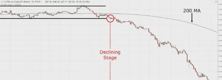 這是市場週期的最後階段。當價格跌破派發區間下沿時進入下跌階段,呈現低點與高點不斷下移的下降趨勢。此時價格運行於200日均線下方,且均線開始向下傾斜。
