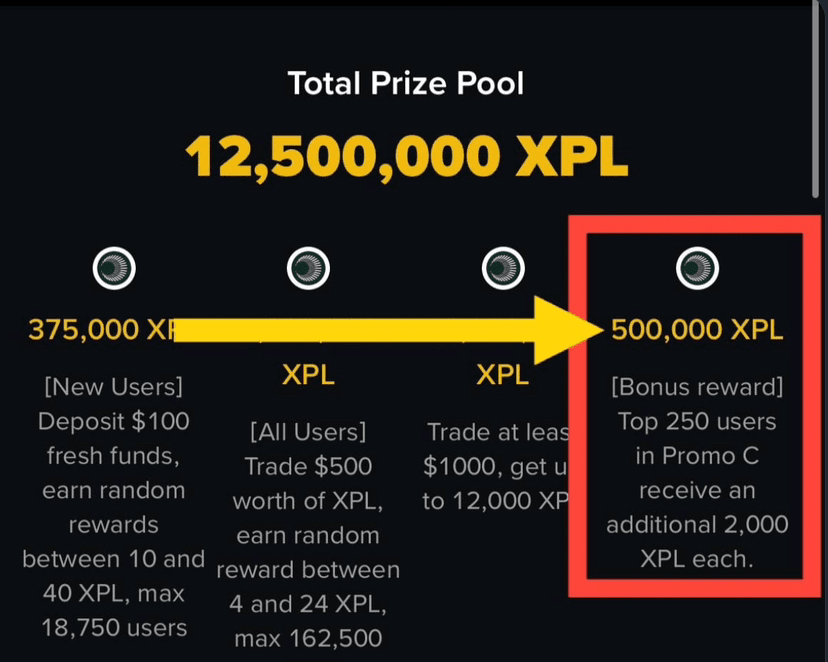 🏷️ $2600 每用戶 ✌️💰 Binance XPL 上市活動爲 250 用戶提供,每個用戶 2,000 $XPL 代幣 Mily ga💫 如果我們查看以往的事件數據,需要 300k$ 的交易量才能進入前 250 名!💎 如果你達到了 300k 的交易量,絕對不會浪費,你還將獲得獎勵,以及額外的 2000 代幣(固定)🕯 請等待最後幾天,到那時幣價也將保持穩定,並且可以瞭解正確的交易量。