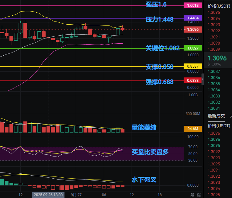 當前XPL卡在1.448壓力與1.082關鍵支撐之間,量能極度萎縮,但買盤竟比賣盤多!