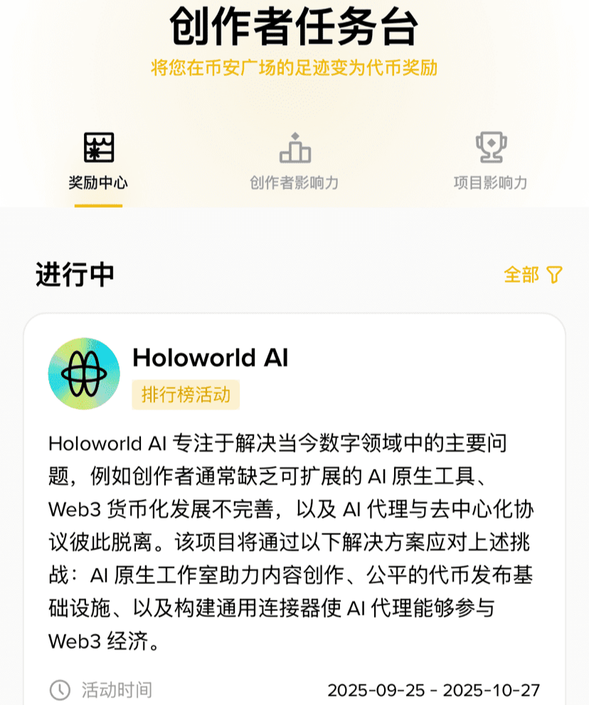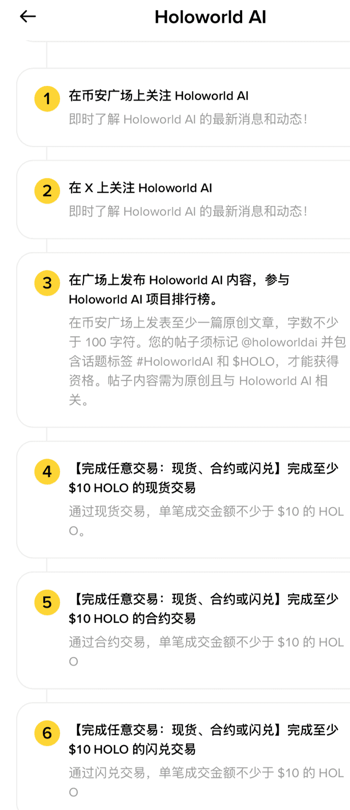 任務 1:在幣安廣場創建至少 100 個字符的項目相關內容,使用主題標籤 #HoloworldAI , $HOLO ,並提及項目賬戶 @HoloworldAI 內容必須與Holoworld AI相關且原創,方可參與。