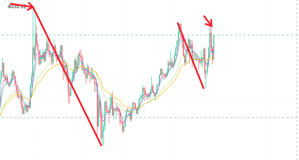 今日衝刺4038上方失敗了,說明上方賣壓強烈,在看一下訂單流,這根K線是沒有進行壓價的,放任上衝,但是依舊沒有突破前高,甚至沒有收在整數位,並且形成插針,讓頂部買進的人直接套牢,這說明市場不認同上漲,就算莊家不壓價,也不認同上漲。現在反而是和前高形成了雙頂壓力位。再看現在的盤面,就是由於前高到4040這一波沒有成功,導致結構變差,也就是說這一波導致了多軍意見分歧。
