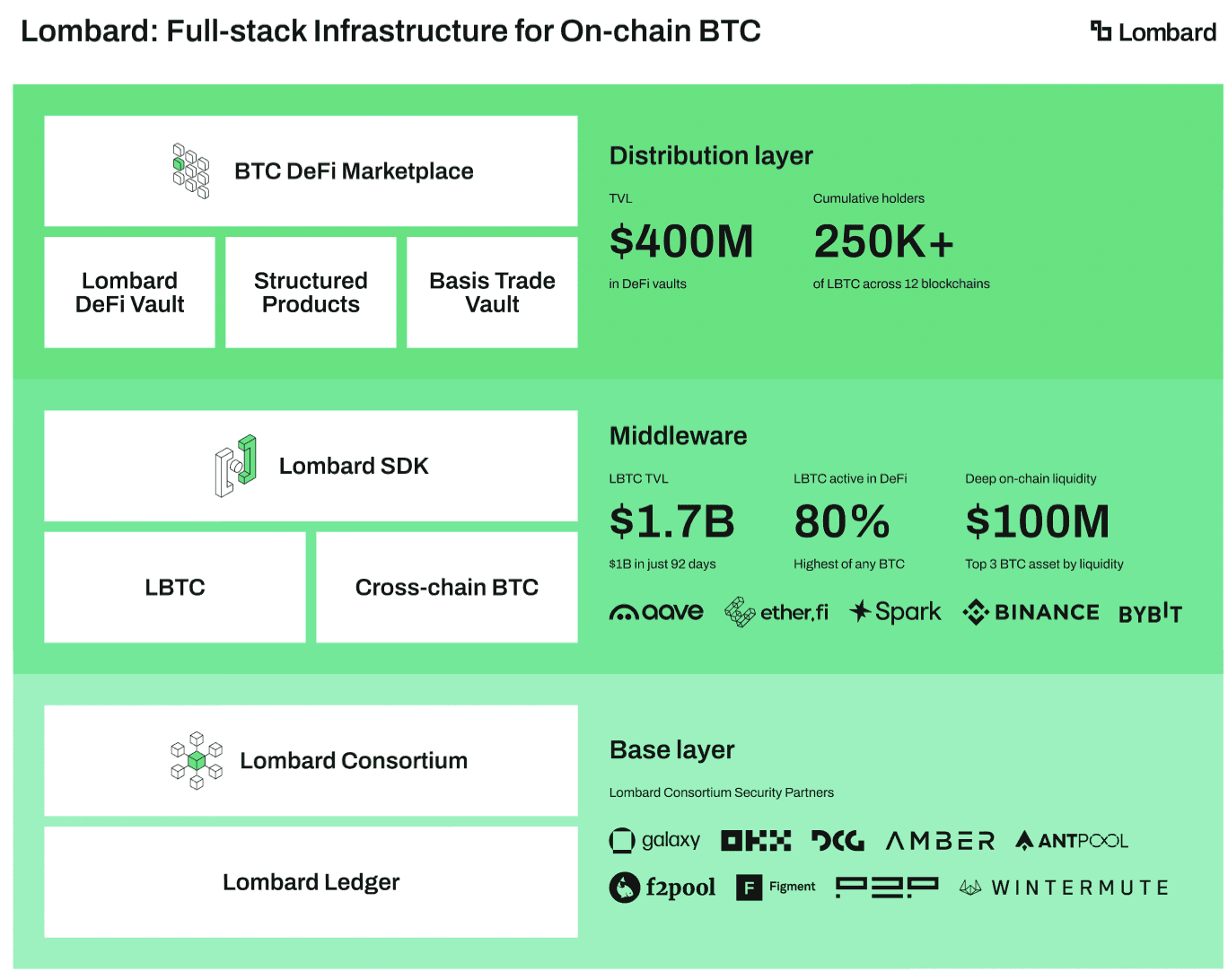 Lombard項目誕生於比特幣DeFi(去中心化金融)生態的迫切需求中。作爲全球市值最大的加密貨幣,比特幣長期以“數字黃金”形式存在,但其在DeFi領域的參與度不足10%,導致數萬億美元的潛在流動性沉睡。Lombard通過創新設計,將比特幣轉化爲可組合、收益型的鏈上資產,旨在成爲比特幣鏈上經濟的“基礎設施層”,類似CME(芝加哥商品交易所)對大宗商品、Tether對穩定幣的賦能作用。