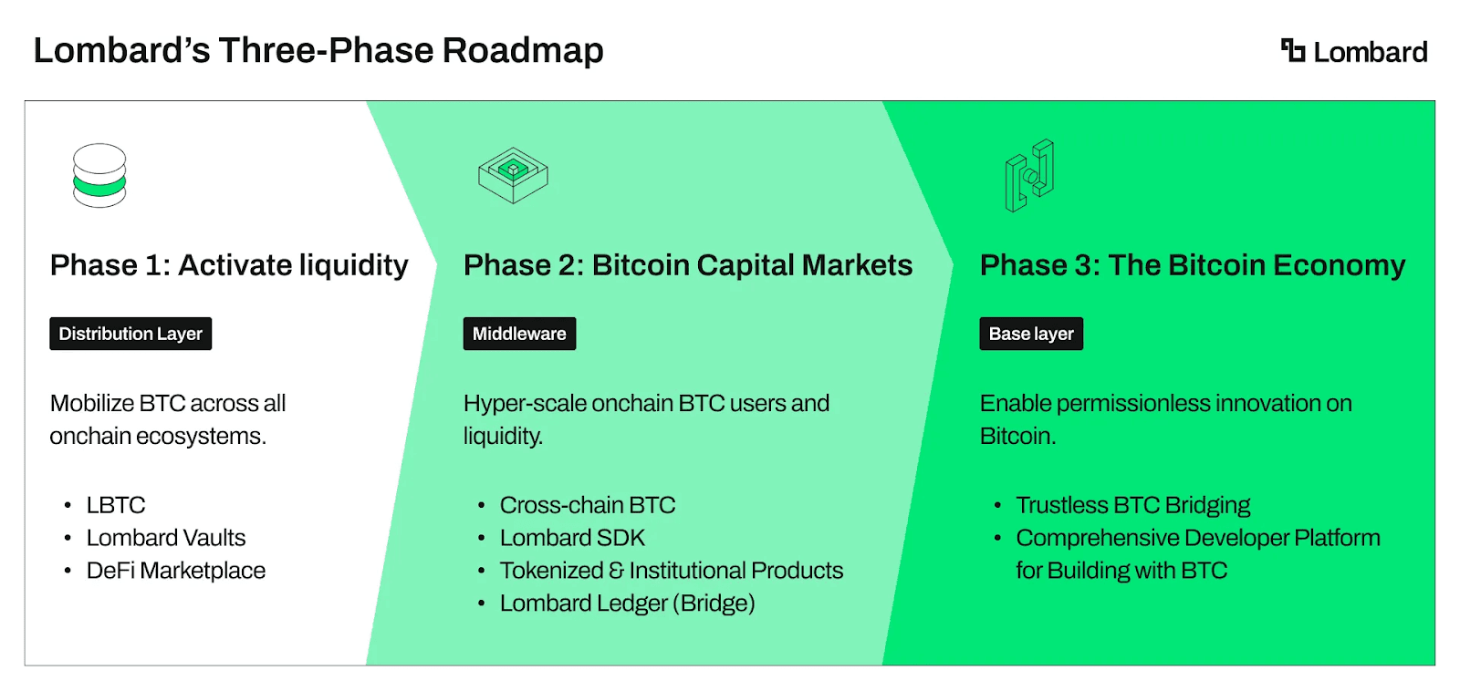 第二階段(進行中):構建資本市場層,開發Lombard Ledger(基於Cosmos的應用鏈)和SDK工具包,支持一鍵質押和自動化金庫。