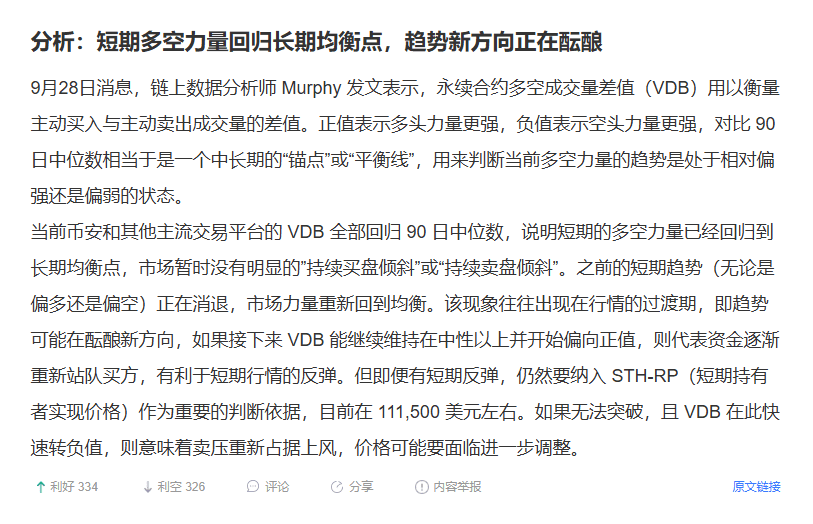 VDB 迴歸 90 日中位數,市場的多空力量暫時打平。這意味着前幾天的多頭急攻和空頭猛砸都消退了,市場正在進入一個過渡期。