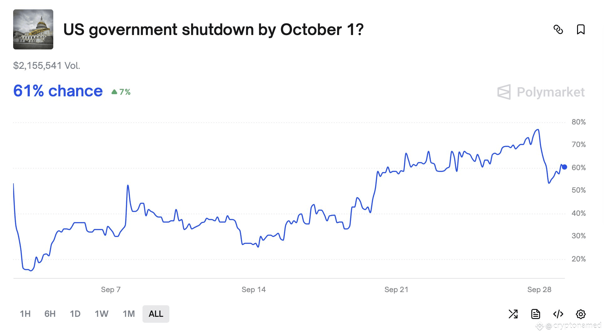 According to prediction markets, there’s now a 61% chance the U.S. government will shut down by October 1st. That’s a massive spike (+7%) in just one day! 📈