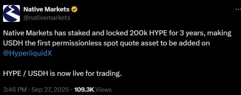 9 月 27 日,Native Markets 正式推出 USDH,目前已經可以在現貨和合約交易中使用。