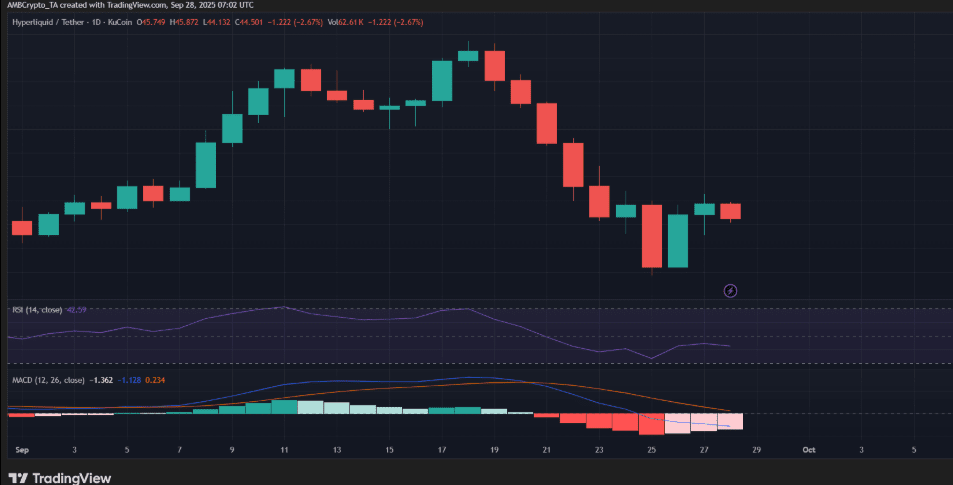 📉 HYPE 現價約 44.5 美元📉 一週跌幅超 20%📉 RSI 明顯偏弱、尚未超賣📉 MACD 維持在零軸下方,空頭動能擴大