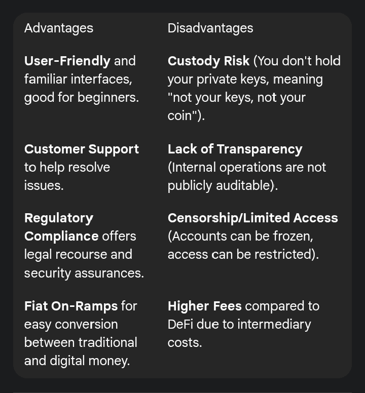 CeFi提供了必要的橋樑,以連接傳統世界——處理法幣與加密貨幣的轉換,並遵循吸引機構投資者的法規。其用戶友好性和客戶支持使其成爲大多數初學者的入門點。
