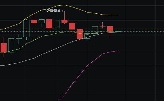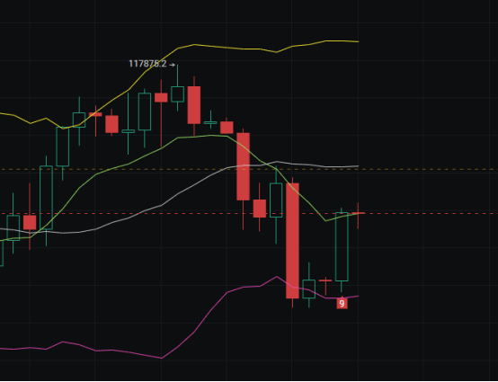 Boll上看,隨着昨天的拉昇,boll由下跌通道變爲了寬幅震盪,價格向上走就先看中軌,中軌能站穩繼續上攻就看上軌。