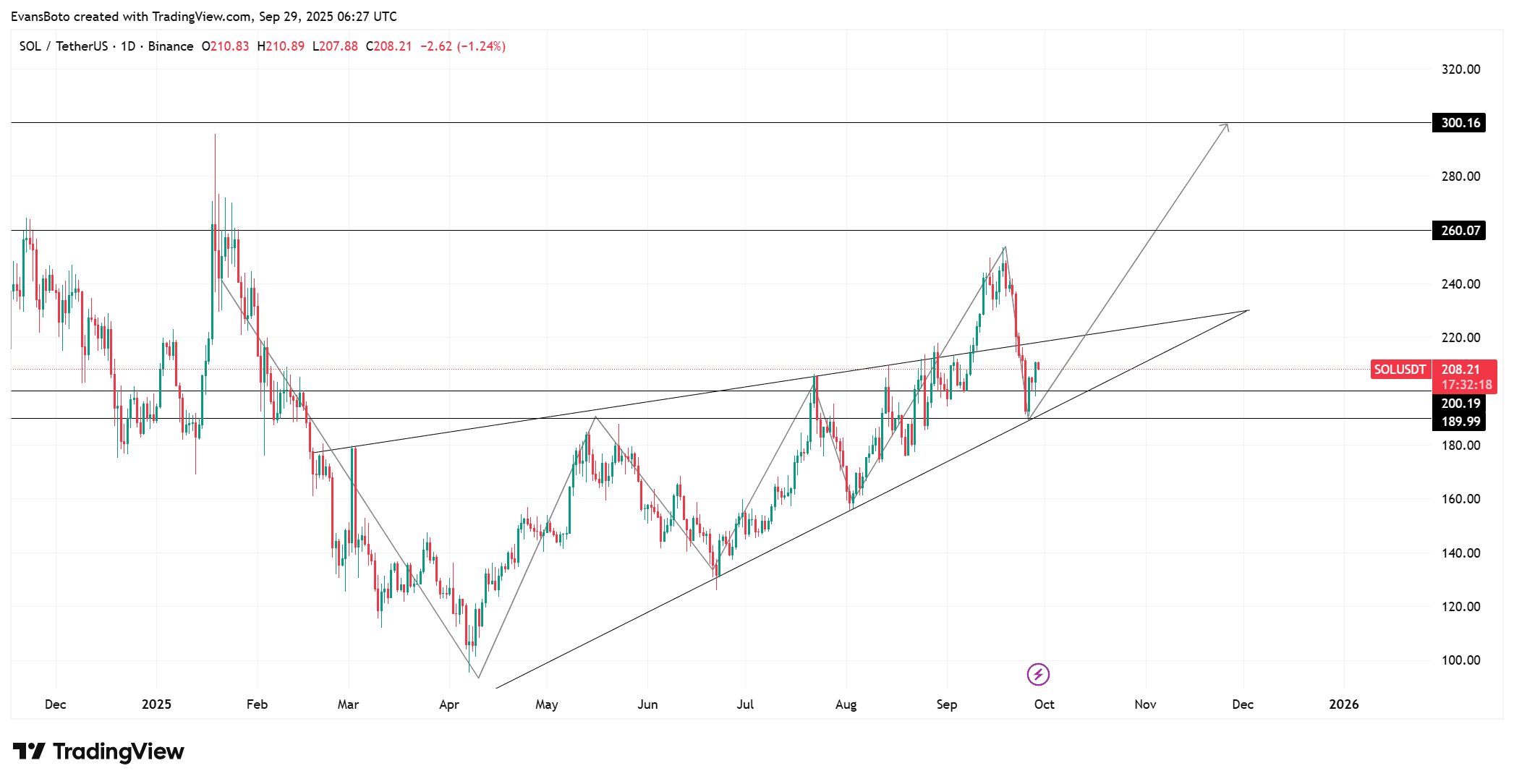 Solana [SOL]捍衛了其上升支撐趨勢線,在 200 美元附近大幅反彈,重新建立了關鍵的盤整階段。