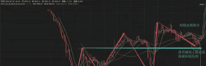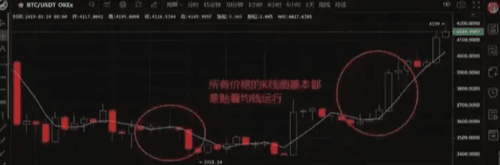 如圖,爲了方便大家看圖,只設置了5日線。圖中可以看到所有價格的K線圖,要麼收盤位置,要麼開盤位置,都是貼着均線運行。週期越短的均線與K線越貼合。