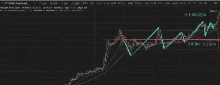 這是一個上升盤整的走勢結構,那我們該如何利用箱體內部的走勢判斷箱體後的方向呢,當箱體內部的第三段下走出來時,就可以發現,走勢只要不跌破箱體的中軌就會被拉起,多頭力量始終保護着結構,結合MACD來看,一直在O軸上方飛起,這是非常強勢的多頭信號,那當突破箱體回踩不破站穩均線時就是多頭非常好的進場點