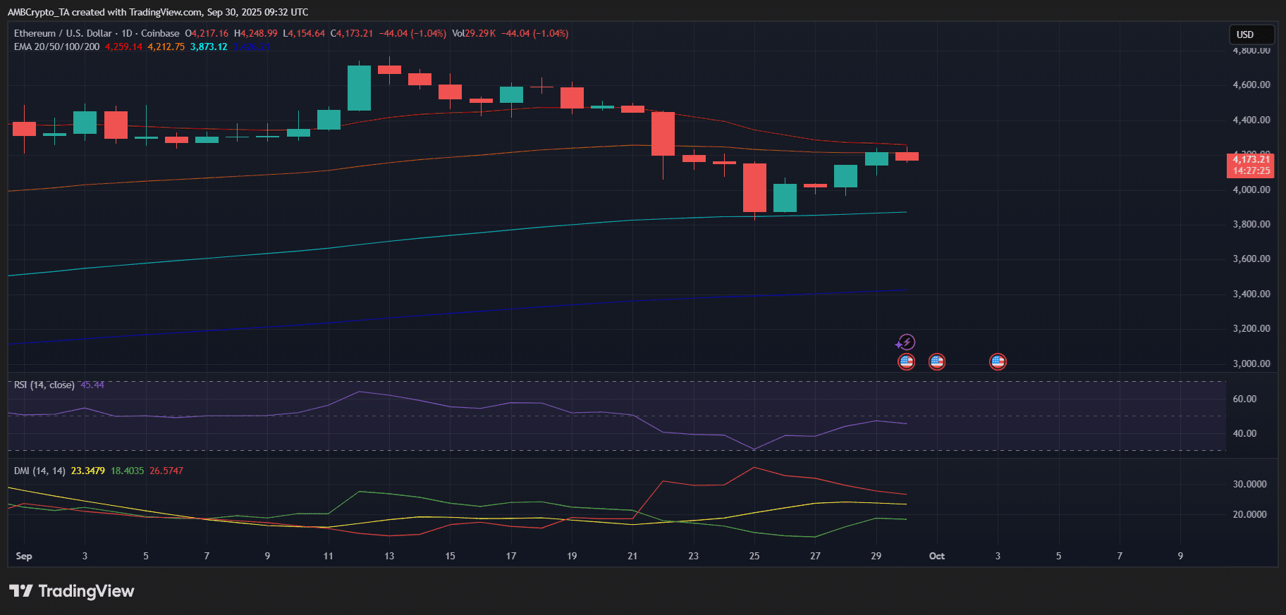 截至發稿時,以太坊交易價格爲 4,173 美元,較上週的跌幅略有回升。相對強弱指數 (RSI) 維持在 45,表明 ETH 處於中性區域。