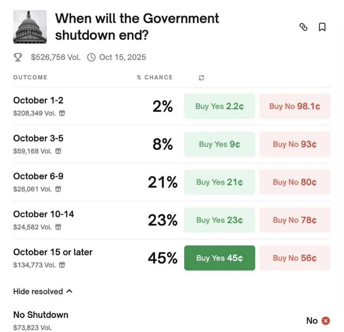 Polymarket 剛剛在華爾街引發了震盪——現在的賠率顯示華盛頓有 45% 的機會陷入美國曆史上最長的政府關停。🏛️💥
