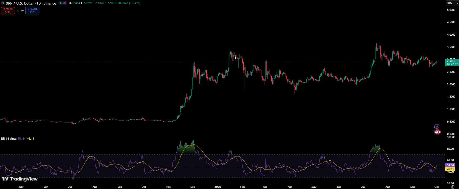 日線圖也描繪了一個建設性的圖景。儘管XRP在今年早些時候經歷了強勁的反彈後正在整合,但相對強弱指數(RSI)徘徊在51左右——這是一箇中性區域,留有進一步波動的空間。如果動能增強,交易者預計突破3美元可能會帶來額外的看漲壓力。