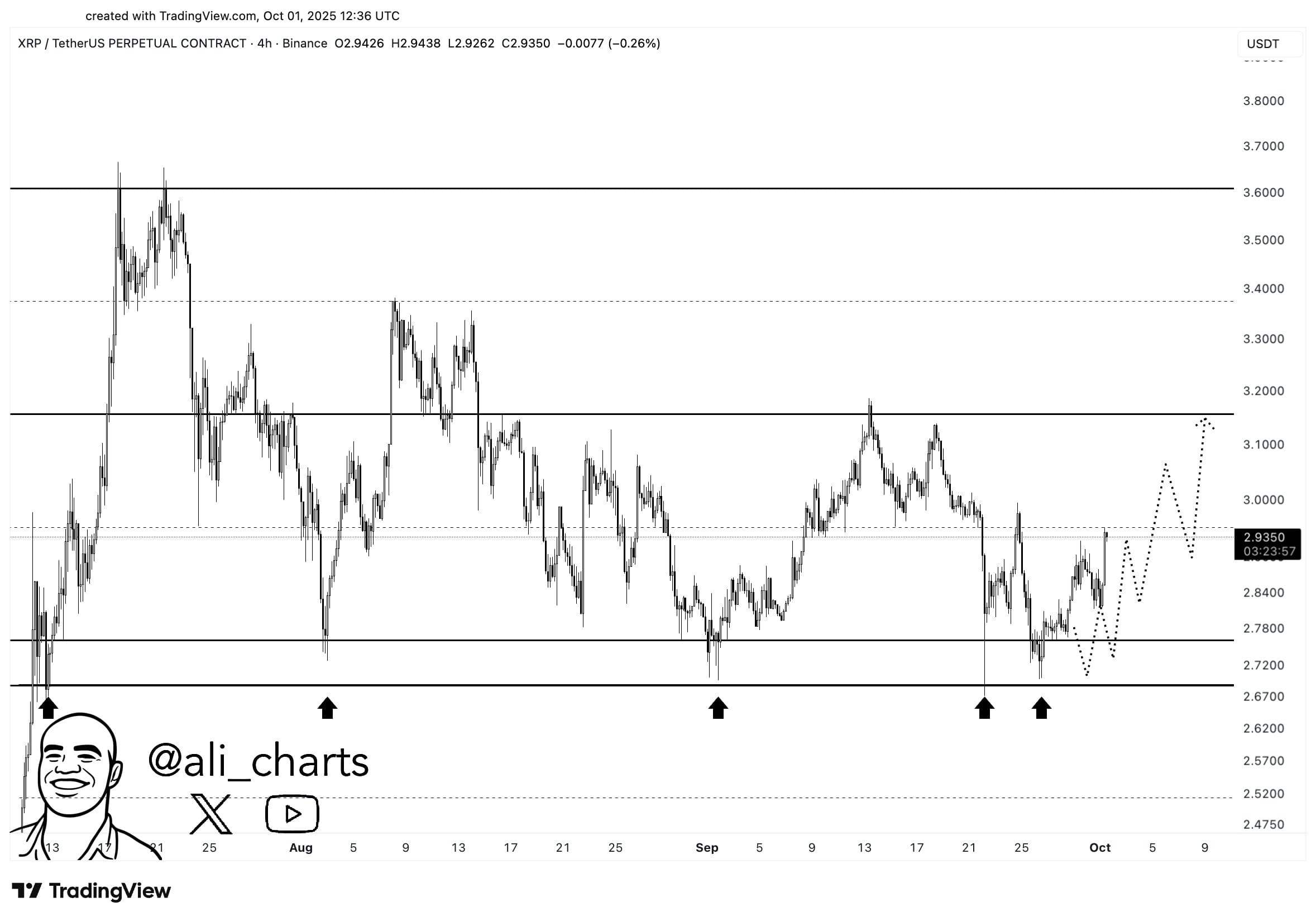 市場分析師Ali Martinez指出,XRP再次在一個關鍵的支撐區域保持強勁。他的圖表分析表明,該代幣可能正在爲向3.00-3.15美元範圍的反彈做好準備。之前對該水平的重新測試一直作爲可靠的跳板,增強了其重要性。