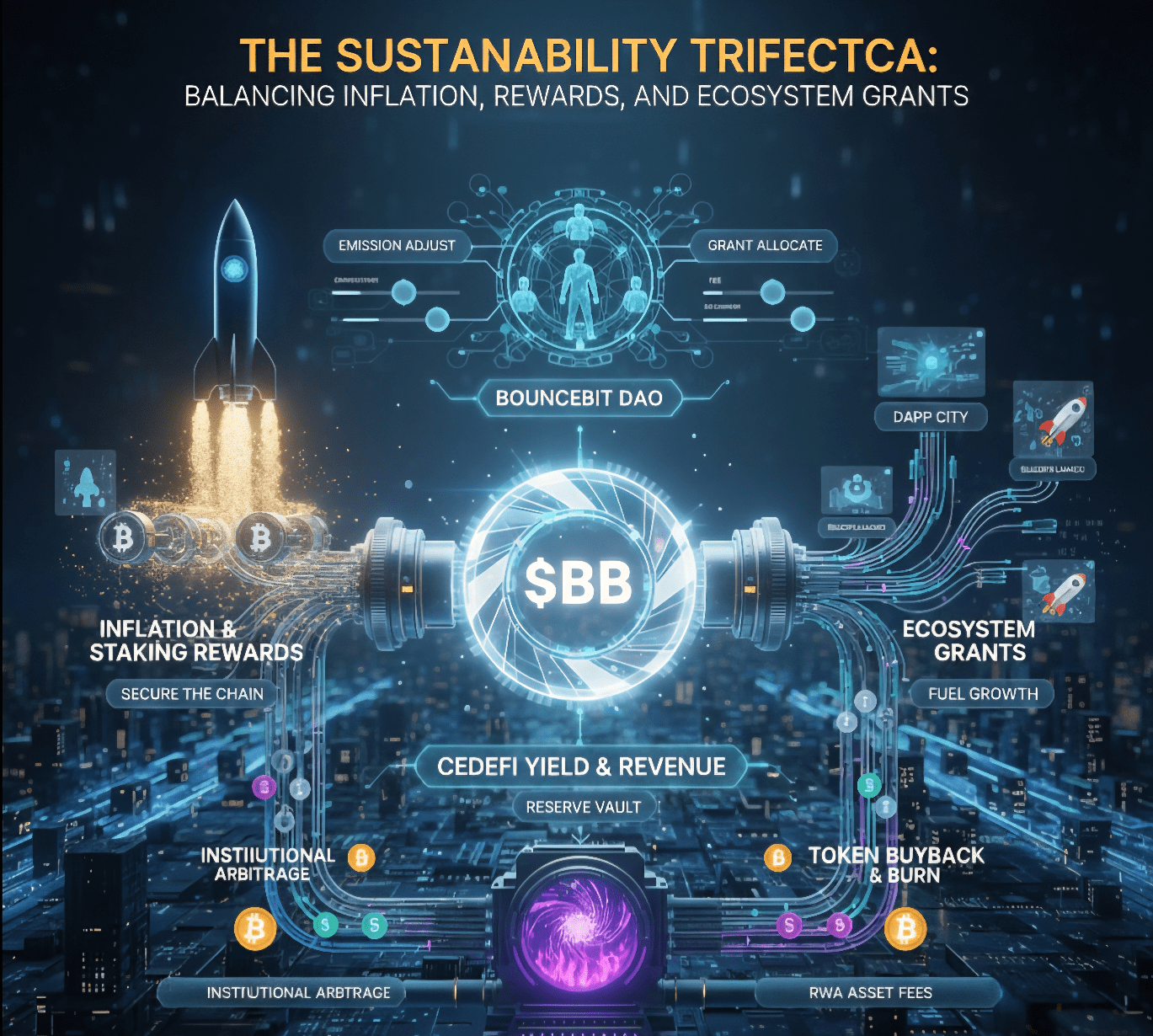 BounceBit網絡,開創了BTC再質押和CeDeFi的敘事,爲動 mobilizing 沉睡中的比特幣資本奠定了技術基礎。然而,這個雄心勃勃的項目的長期成功不僅取決於其代碼的優雅性,還取決於其經濟引擎的精細工程——$BB tokenomics。這種代幣是燃料、抵押品和投票股份的合一,其設計必須經得起市場週期的殘酷考驗。BounceBit DAO面臨的根本挑戰是“可持續性三重奏”:平衡爲確保鏈條而需要的通貨膨脹質押獎勵、吸引增長的生態系統補助,以及最終的通貨緊縮機制以保護$BB的價值。如果搞錯了,這項創新技術將成爲一座通貨膨脹的紙牌屋。