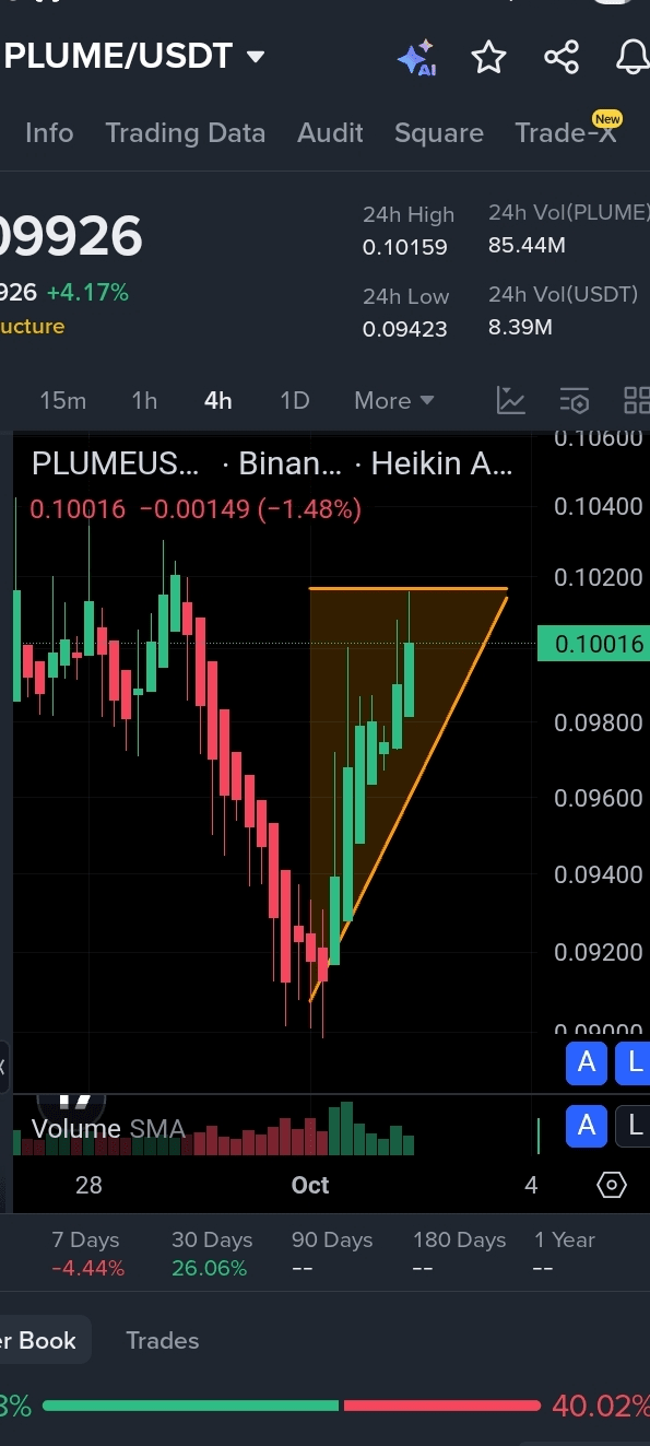 $PLUME /USDT 交易對最近經歷了一次劇烈的回調,現在正在進行強勁的反彈。上升三角形模式的形成和訂單簿中重磅買入(59.98%)的權重表明短期內看漲的前景,交易者可能在關注突破約 $0.10100 的阻力位。
