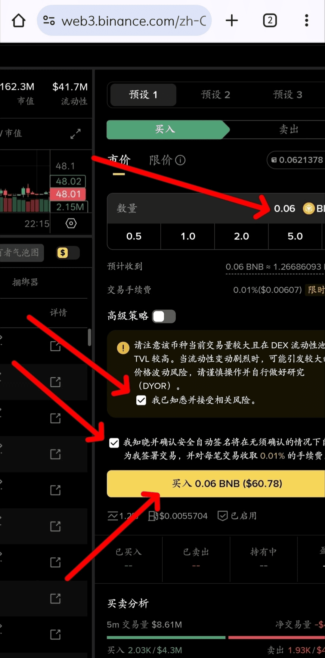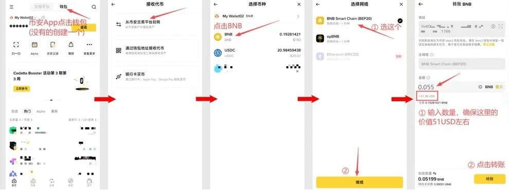 1、轉約51U的BNB(0.055個BNB)到錢包,網頁版不能用U、只能用BNB交易,沒有的話可以用手機從交易所購買。