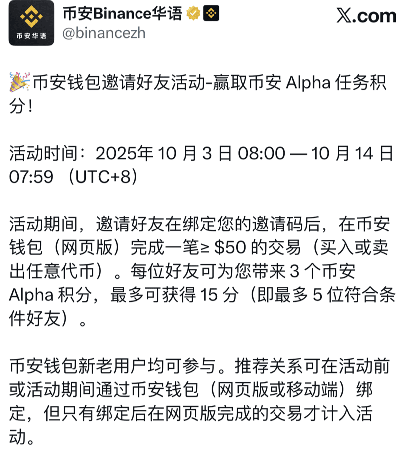 10月14日07:59前,邀請好友在綁定您的邀請碼後,在幣安錢包(網頁版)完成一筆≥50美元的交易(買入或賣出任意代幣)。每位好友加3個積分,最多可獲得15分。