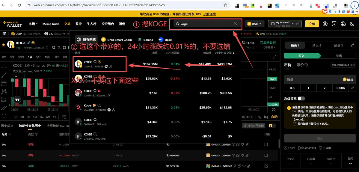 4、 用BNB買入>51U(0.055個BNB)的KOGE,並立即賣出。