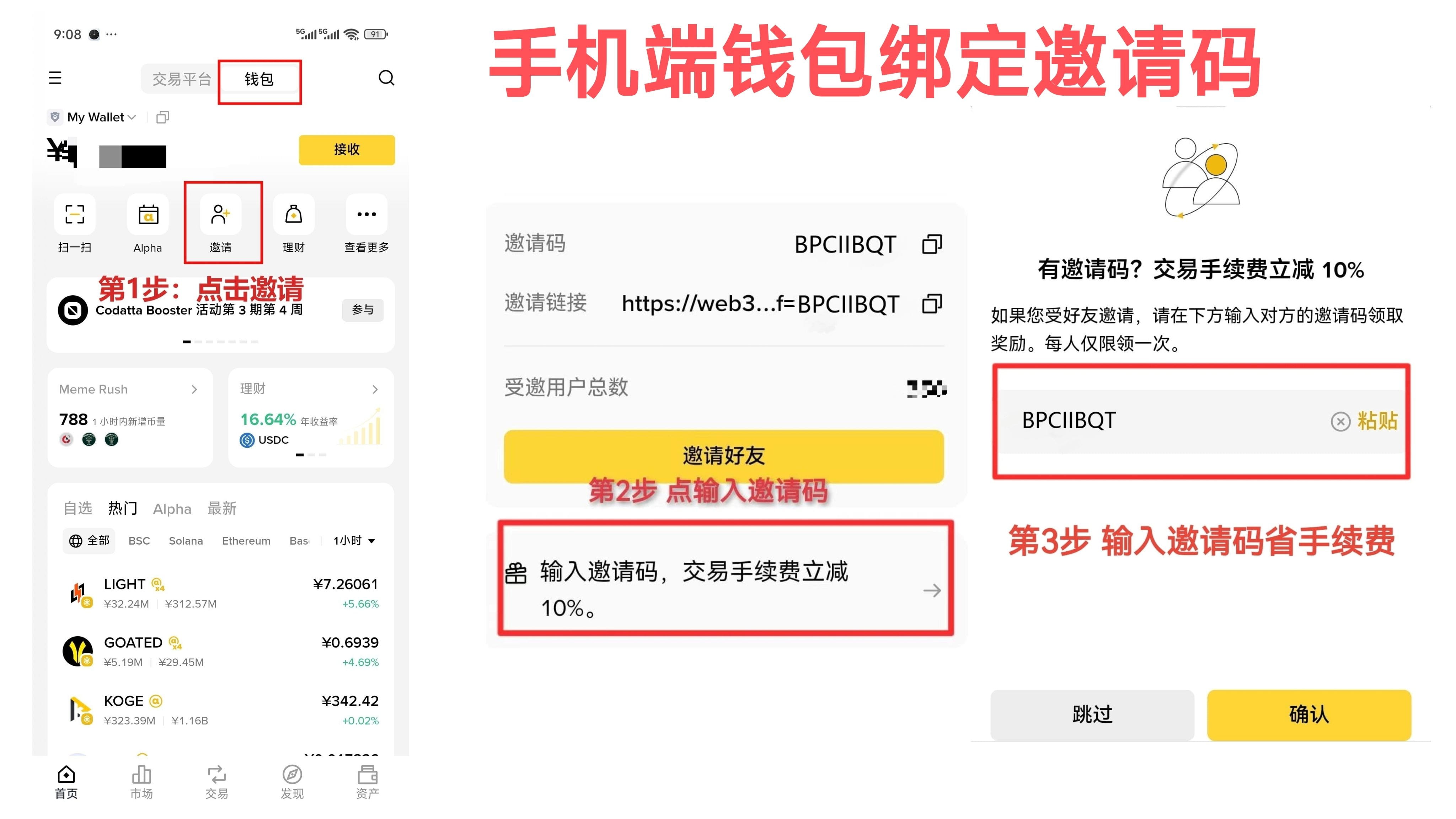 【手機端錢包綁定邀請碼操作:第1步,先複製優惠碼BPCIIBQT,打開錢包,點擊“邀請”