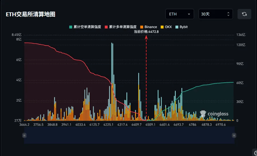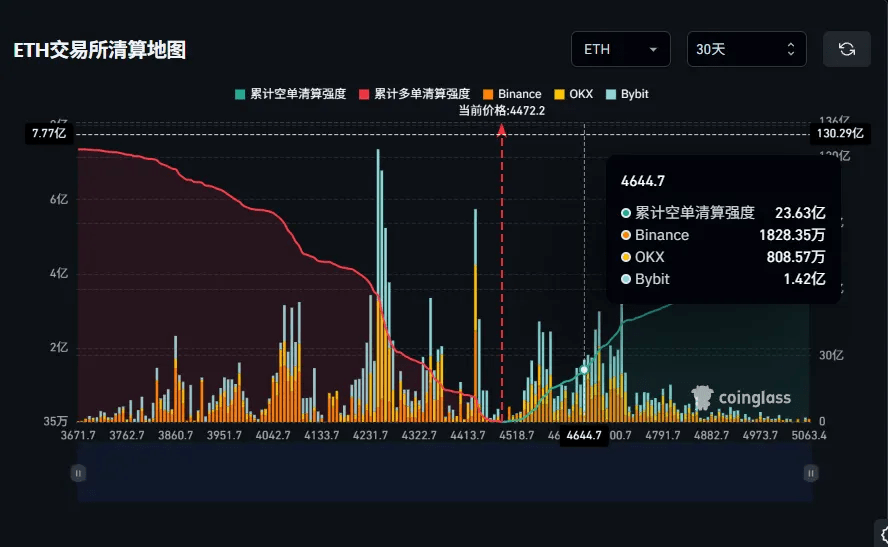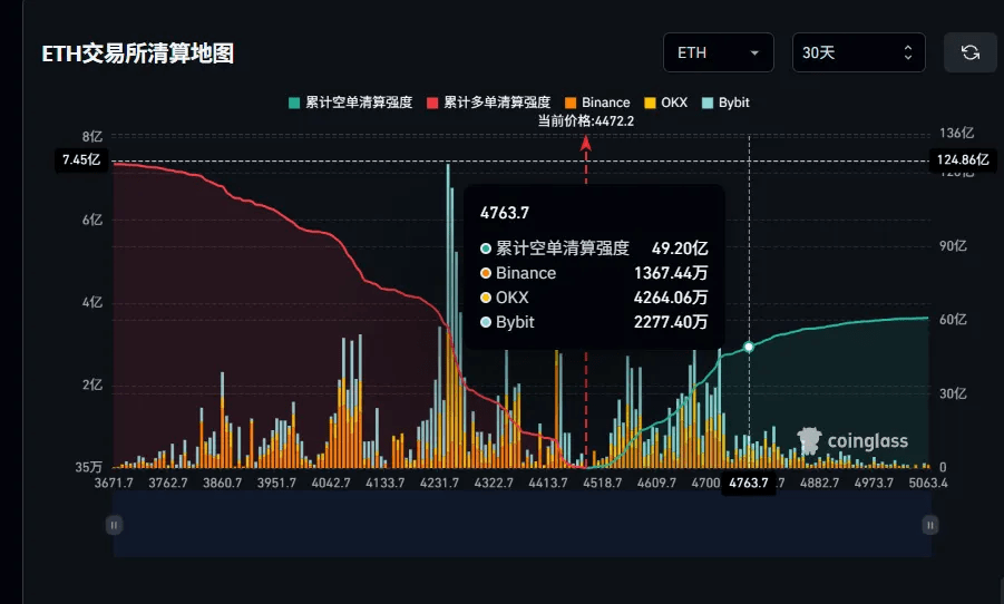 先看清算地圖,30天的清算地圖,可以看到除了在4700左右還有點空單,再往上就不多,根據前面科普的,這種拉漲,是需要以空單爲燃料來助推上漲的,沒有燃料,強行拉價格到5000點整數位,除非是發病了。