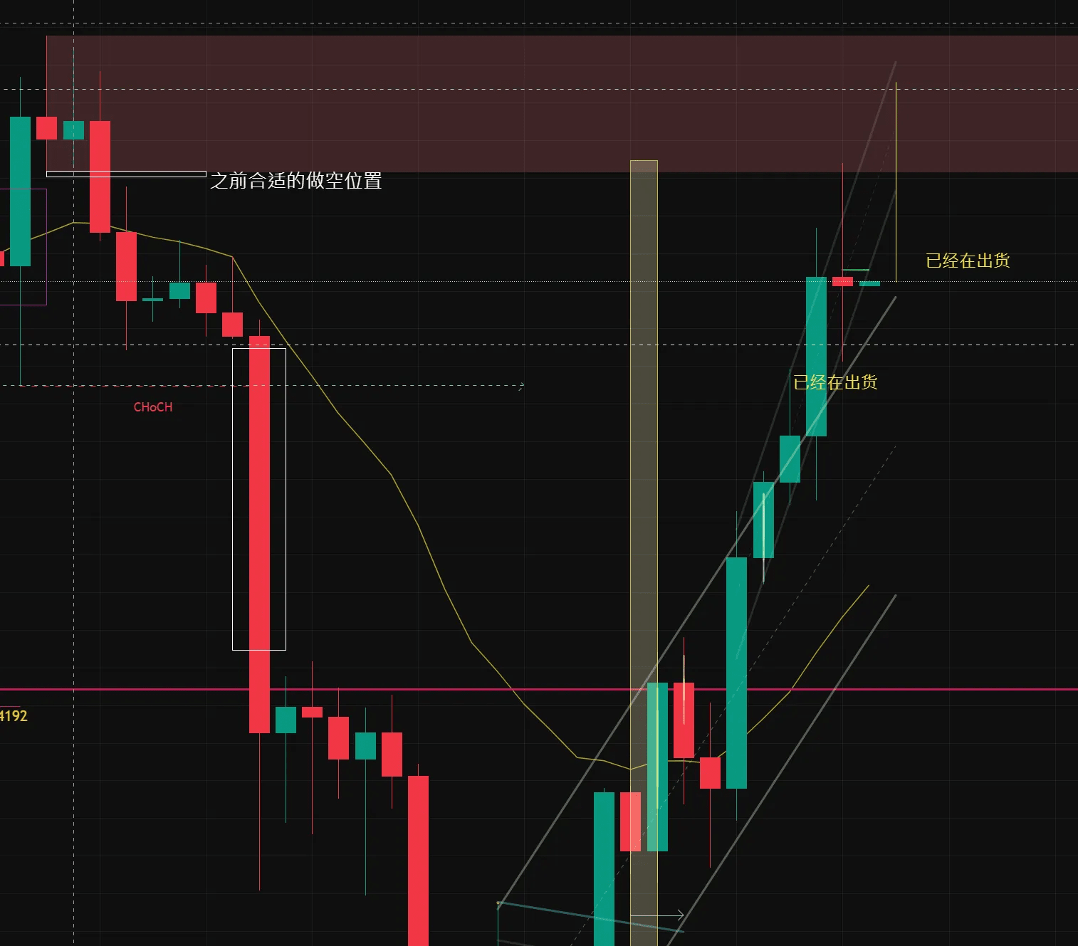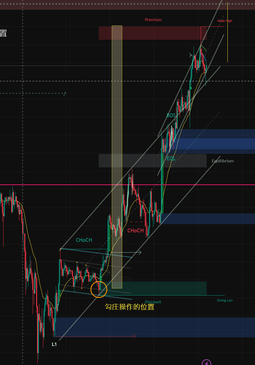從勾莊的操作到現在已經硬拉了533點,漲到這個位置,也算是把之前下跌留下的FVG給填補了,然後劇本大家都知道了,就是拉高出貨,然後瀑布。如果連這個都不知道,可以去翻之前的文章,現在散戶關注的點就是高點究竟在哪裏?哪裏是做空的最高點?