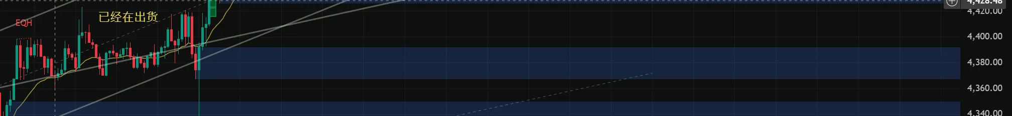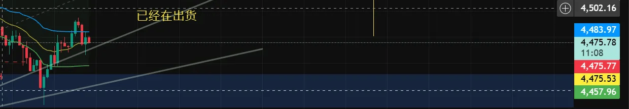 先看最新的這一段【4427,4560】,這一段應該是非常明顯的一個主力出貨的表現。特別是剛纔突破4495之後,就沒有好的跟隨,去繼續突破4500點。所以把這一段區間認爲是主力在出貨的區間是很高概率的。