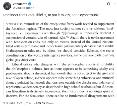 Buterin 強調了 Thiel 2007 年的文章,其中投資者稱讚像 Echelon 這樣的監控系統作爲新的“美國和平”的基礎。根據 Buterin 的說法,這種觀點與加密朋克去中心化和隱私的理想直接對立——這些原則正是比特幣和以太坊的靈感來源。