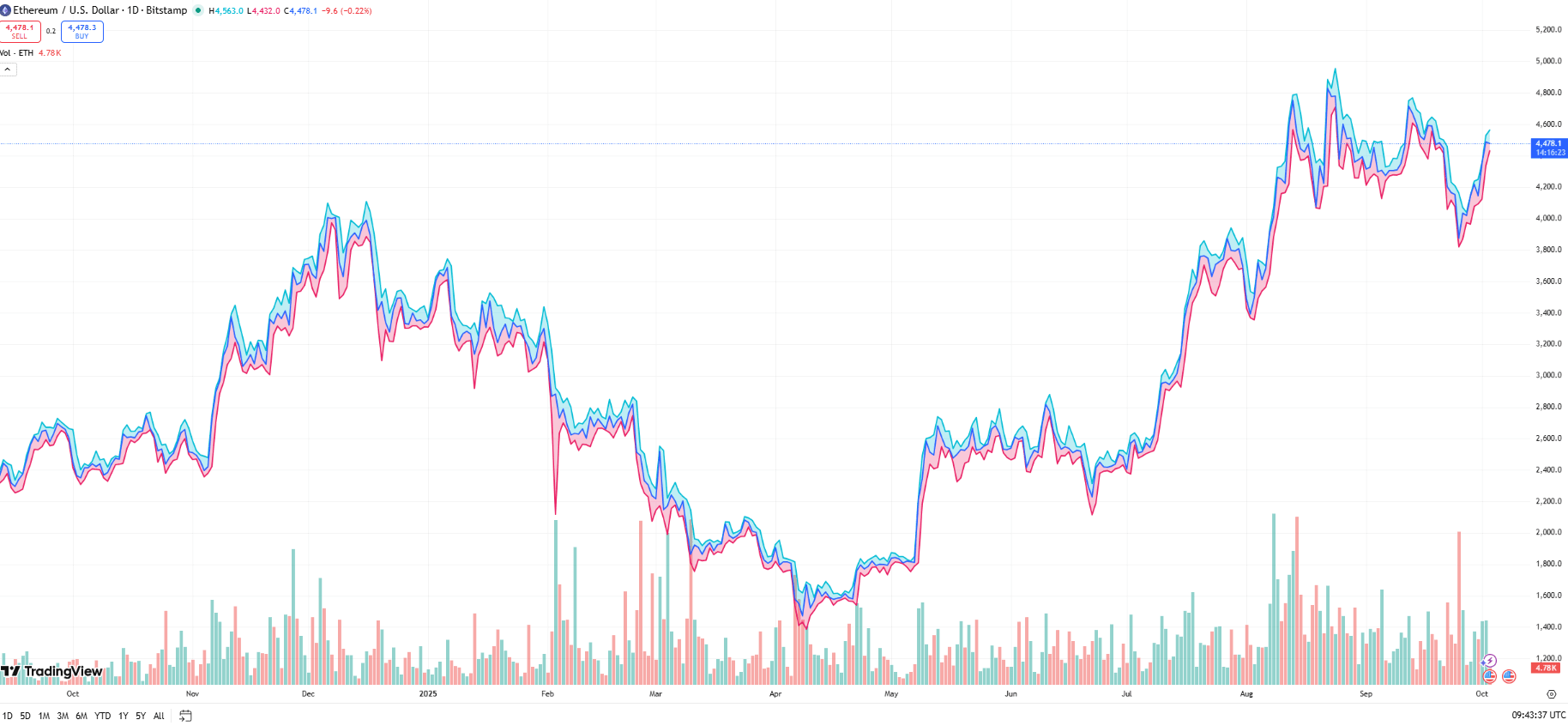 儘管哲學辯論激烈,但以太坊的市場表現依然強勁。ETH最近突破了$4,500,並繼續顯示出看漲的勢頭。技術指標(RSI爲62,MACD上有看漲背離)表明,該代幣可能在10月份測試$5,000的關口。