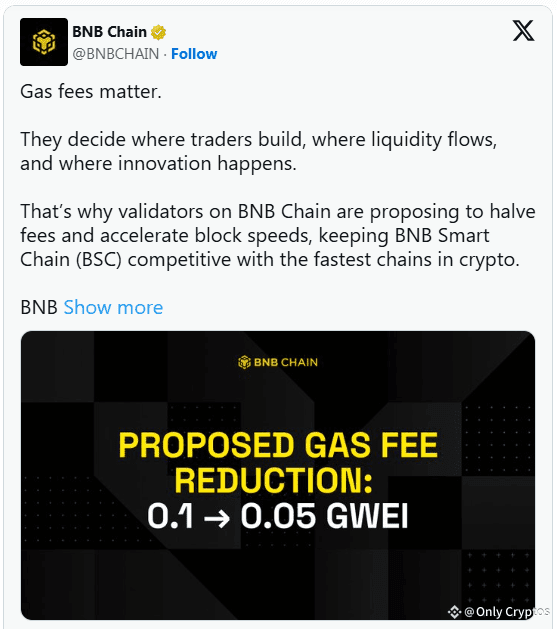 Validators Float BNB Chain Fee-Cut & Faster Blocks: BNB Chain highlighted validator moves to lower gas (another 50%) and accelerate block intervals. This aims to attract traders/liquidity and improve UX for agents and perps.