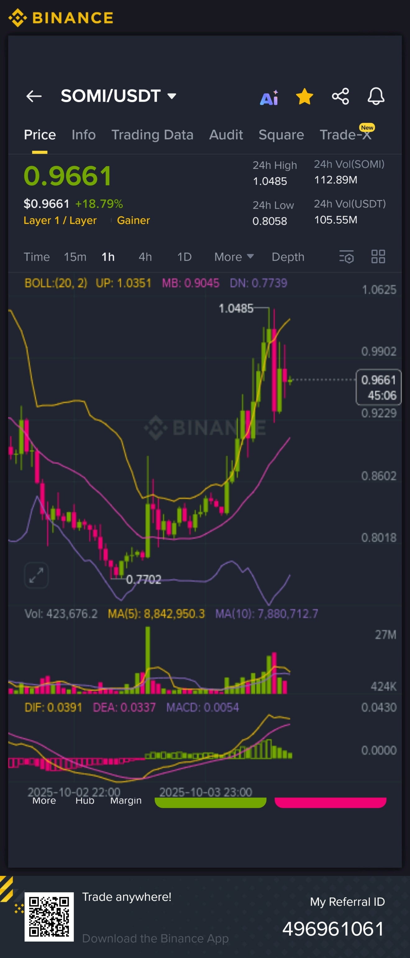 在今天的1小時圖表中,我們看到SOMI交易價格約爲$0.96,過去24小時上漲約+18%。這是在測試高點$1.0485後,從$0.8058反彈的情況下。布林帶顯示MB = 0.9043和UP = 1.0346之間的壓縮,這意味著波動性在潛在突破之前正在收緊。