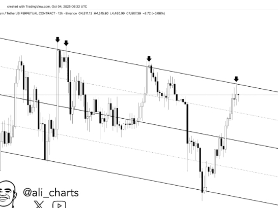 根據市場分析師Ali的說法,以太坊已經測試了同樣的阻力水平四次,每次都遭遇了一波賣壓。12小時圖清楚地顯示了這種模式——$4,600作爲天花板,而$4,300–$3,800則作爲關鍵支撐區間。