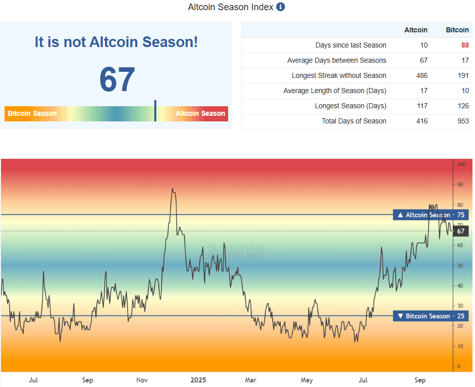 - Altseason 指數 - 67