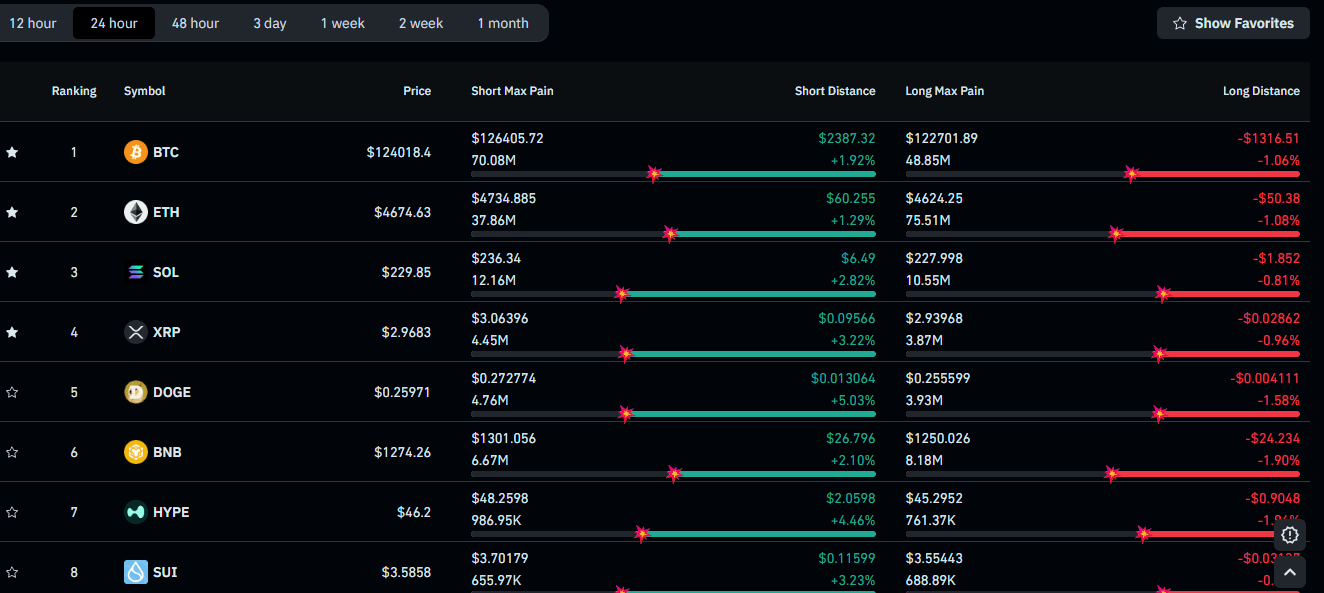 📈 在主要交易對中,空頭正在受到擠壓,而多頭頭寸仍與最大痛苦水平保持適度距離。