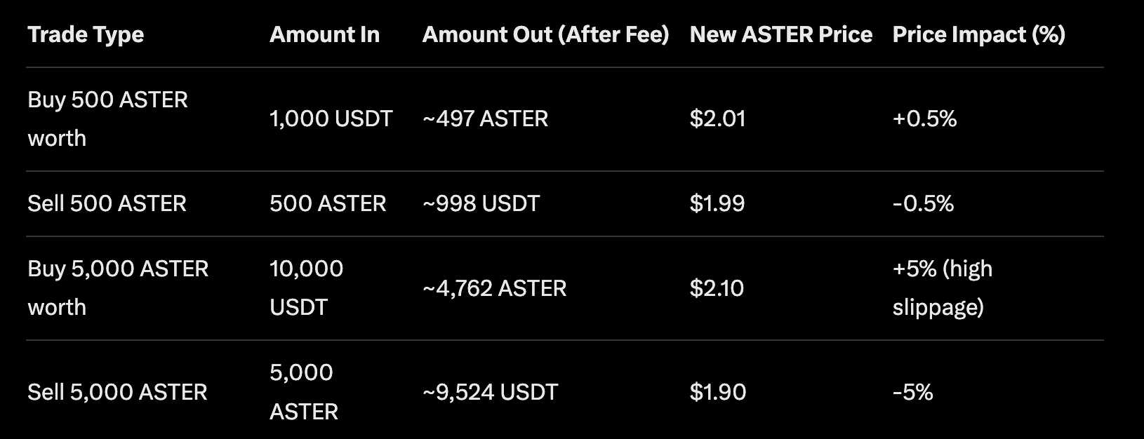你獲得你的代幣(扣除滑點費用):資金池給你差額:100,000 - 98,995 = 1,005 ASTER。等等,比你想要的多?那是價格影響——購買會稍微推高 ASTER 的價格,因為你在減少資金池中的供應。