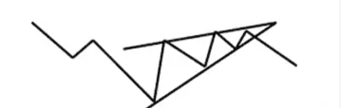 便形成了一個向上傾斜的三角形形態。而此形態與下降三角形不同,因爲下降三角形的下邊線是水平的,而此楔形的三角形的兩條邊線都是向上傾斜的。如果價格最終突破現行的下邊線,就形成了—個短期賣出點。