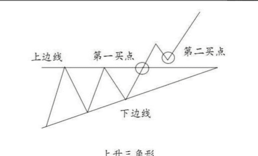 和最低點分別用直線相連,就形成了一個三角形形態。這個三角形的特點是上邊線是水平的,下邊線是向上傾斜的。