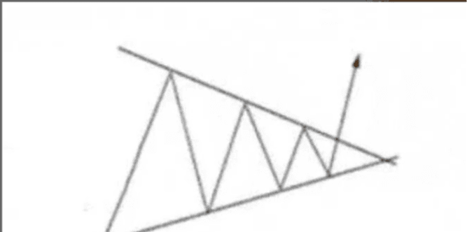 中突然出現一段時間的窄幅波動,而且在波動中每次的最高點依次降低,但是每次形成的最低價卻