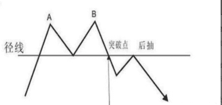 如上圖所示爲二重頂形態示意圖。雙方形勢是價格連續兩次向上衝某一高點都沒有成功突破,而轉而下跌:當價格最終突破前期低點所在的價位時,便形成了下跌的一個行情。將前期低點用水平線連接,便形成了雙重頂的頸線。因此只因價格突破雙重頂的頸線,短線交易者就可以選擇賣出。
