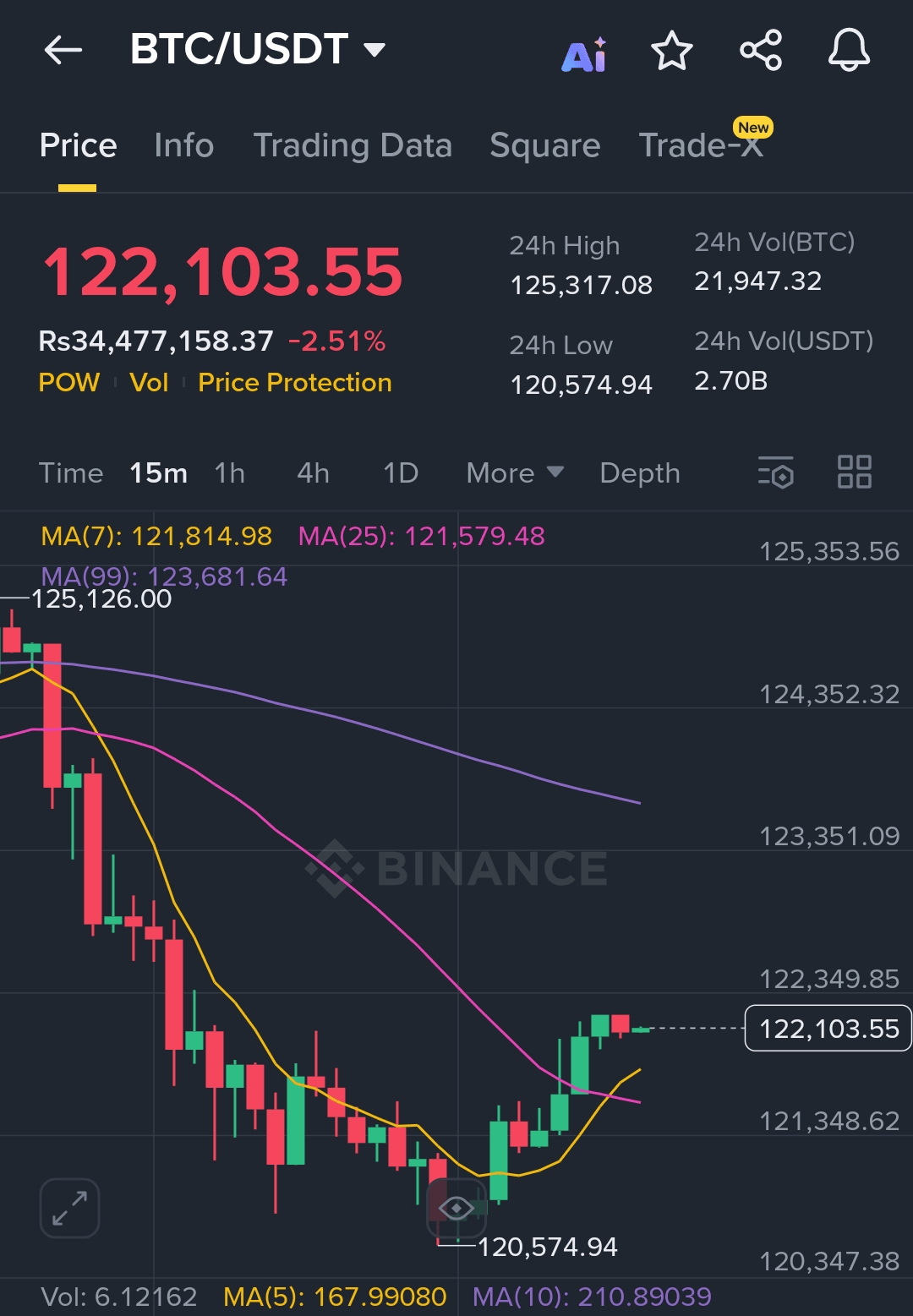 $BTC 正在以$122,103(-2.51%)交易,之前在$120,574附近觸及24小時低點——這是一個關鍵支撐區,觸發了短期反彈。