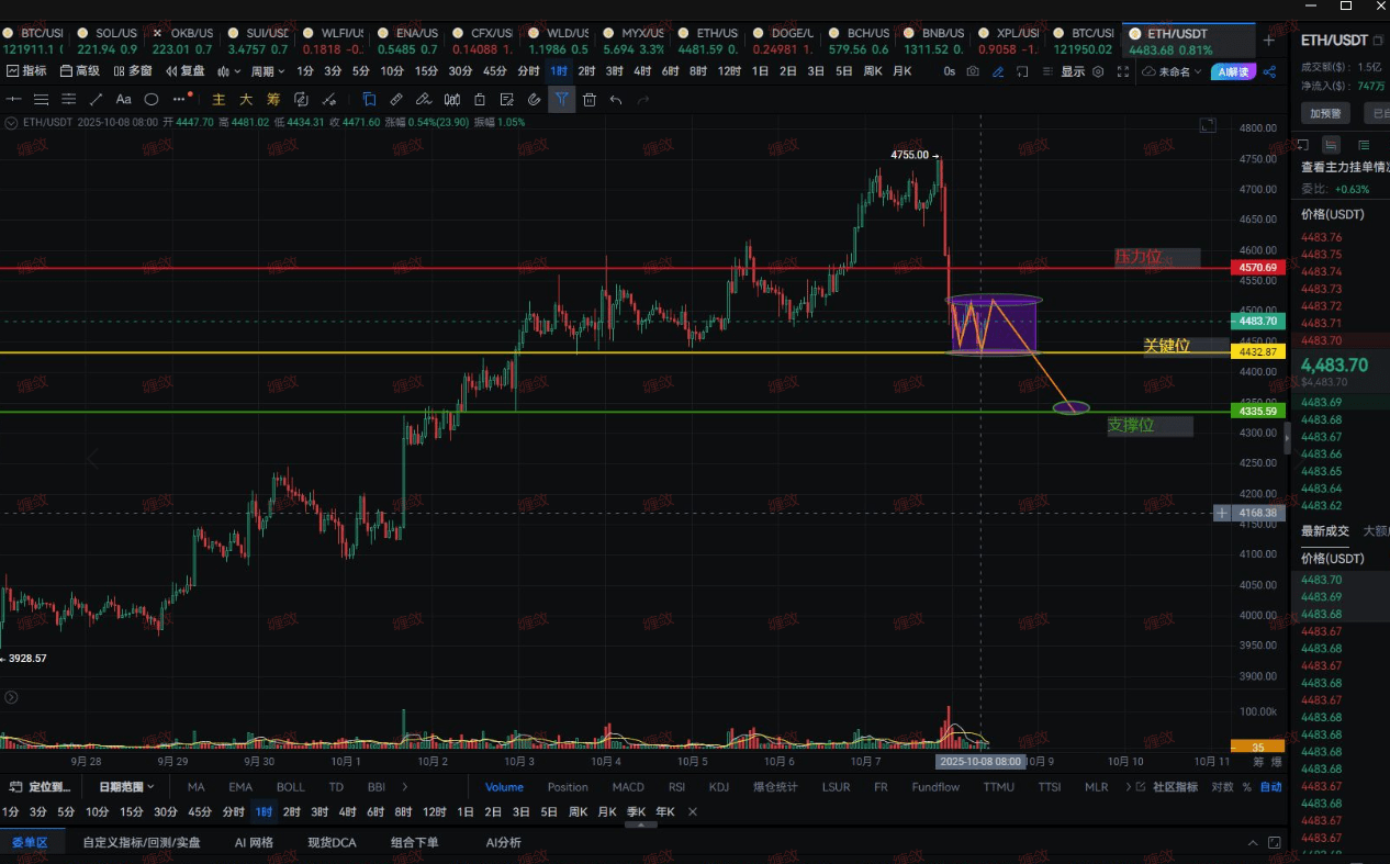 1小時K線圖已拉響警報!4432關鍵位在10月8日兩度被擊穿,形成“雙頂陷阱”,而4570壓力位與BOLL上軌重合,構成死亡封鎖線!