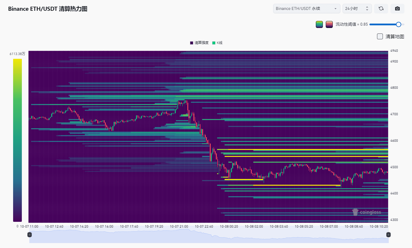 更可怕的是,清算熱力圖顯示,4500-4700區間堆積着6113萬USDT爆倉單,一旦跌破4432,鏈式清算將瞬間引爆!