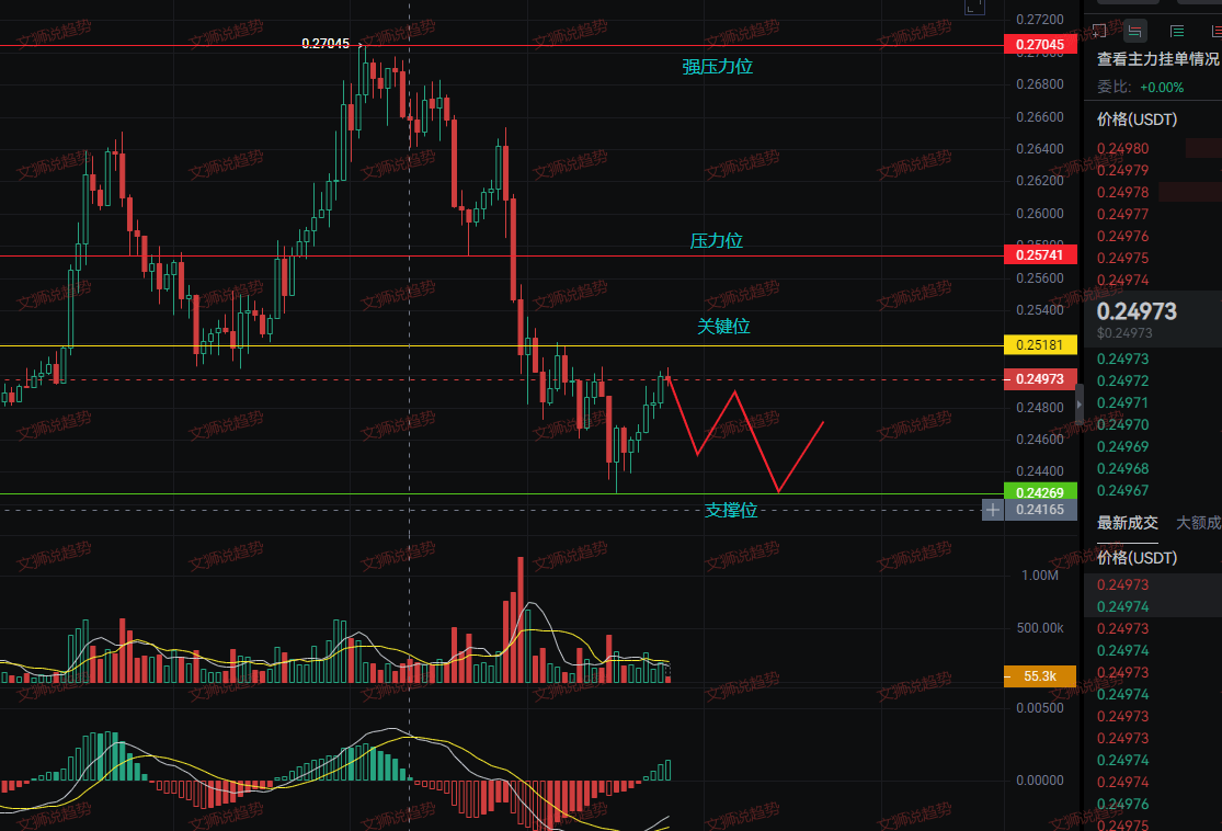 從圖表數據看,DOGE的強壓力位集中在0.25741附近,而0.25181是近期多空爭奪的“咽喉要道”。如果價格能站穩0.25181上方,並伴隨放量突破,短期暴漲至0.25741的概率極高——但這需要多頭資金持續發力!