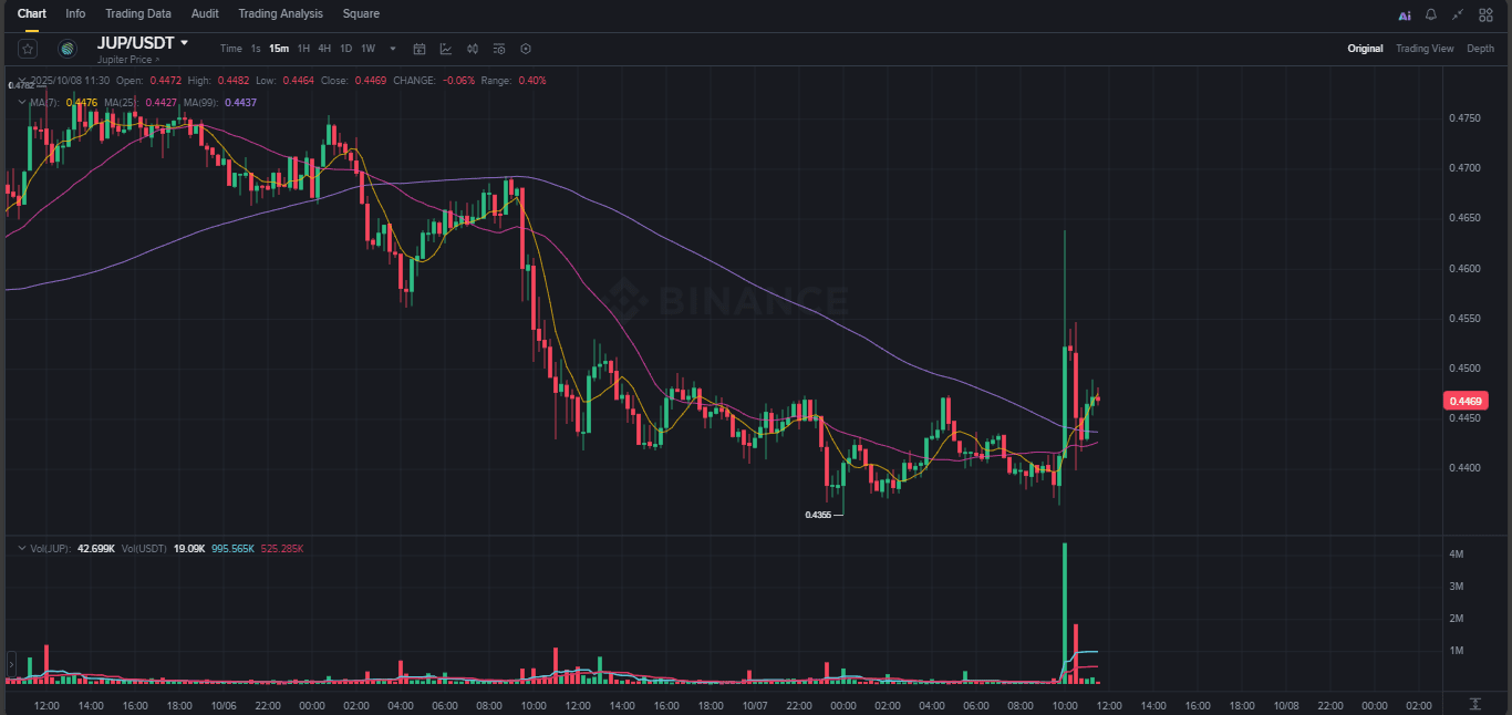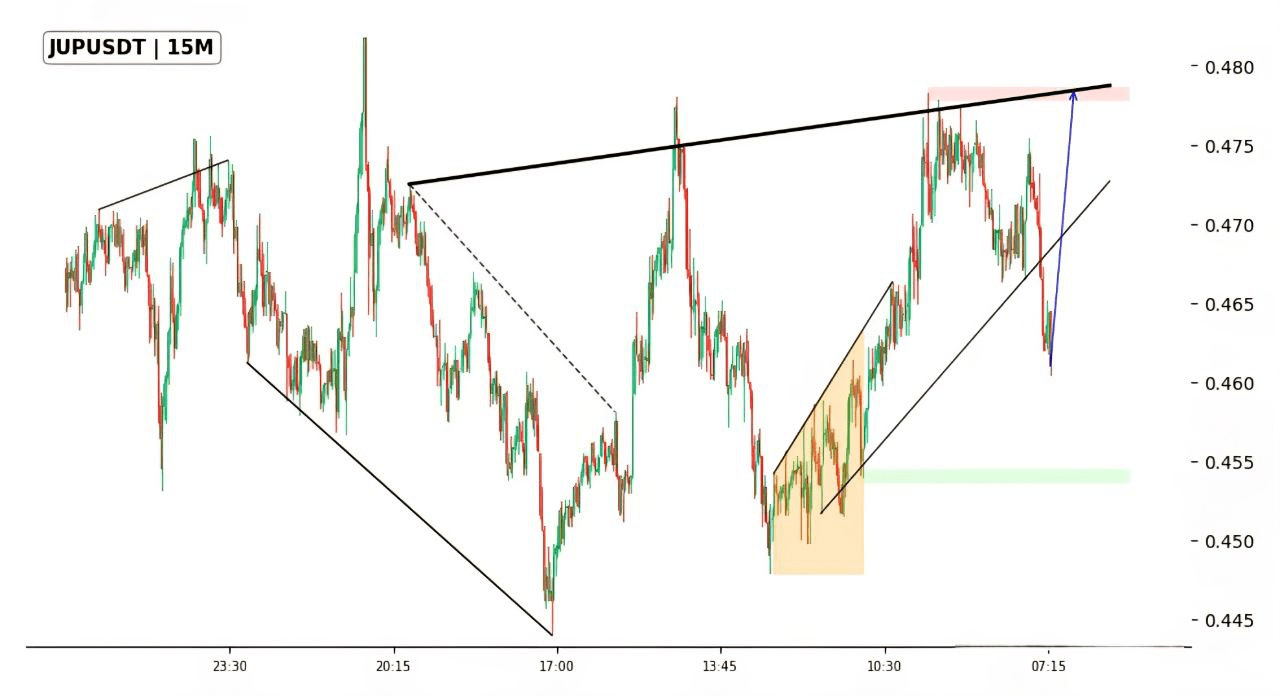 JUP圖表顯示出高度累積的技術結構。價格持續形成更高的低點,壓縮在約$0.478的關鍵平坦阻力區。此整理代表了一種力量的平衡,通常會在波動性擴張之前出現。