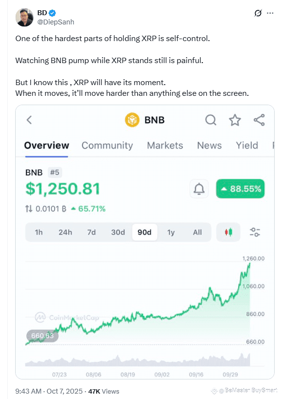 呼籲關注BNB最近的牛市運動,XRP社區專家Diep Sanh指出,保持XRP的自控是一個最困難的部分。這是因為當其他資產看到驚人的增長時,這種山寨幣經常落後,這會引發投資者的不安,傾向於出售他們的持股。