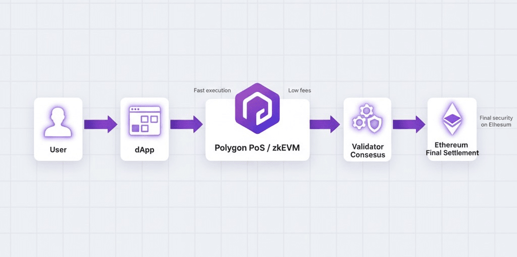在其核心,Polygon將以太坊的安全性與其自身的高速基礎設施結合在一起。以下是典型交易在網絡中流動的方式: