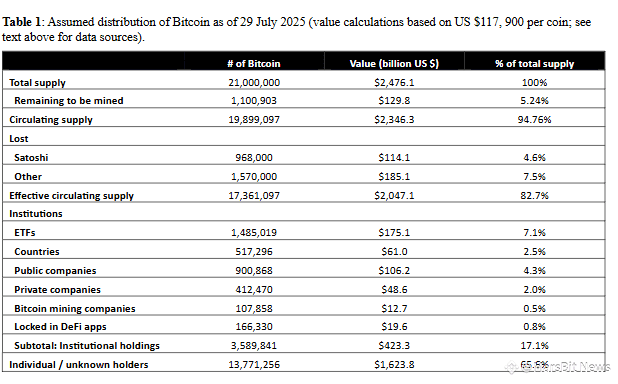 研究团队的统计显示:中本聪早期挖出的约97万枚从未移动,普遍认为已无法访问;保守估计约有157万枚因私钥丢失而永久损失;剩余1736万枚的"有效流通供应"中,有1440万枚超过155天未在链上移动,被归类为"非流动供应"。