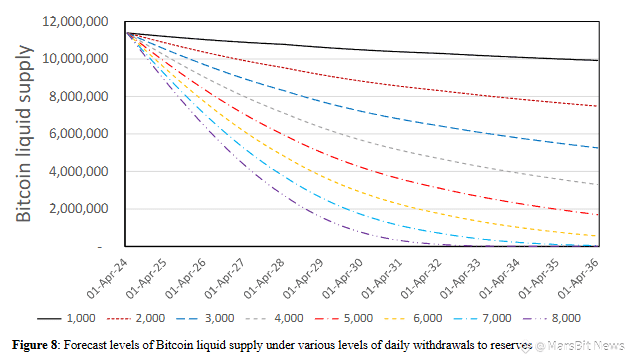 研究显示,如果每日退出流通维持在6000枚,流动供应会在2029年底前降至200万枚以下;如果退出流通速度加快到7000枚,这个时间点会提前到2028-2029年。